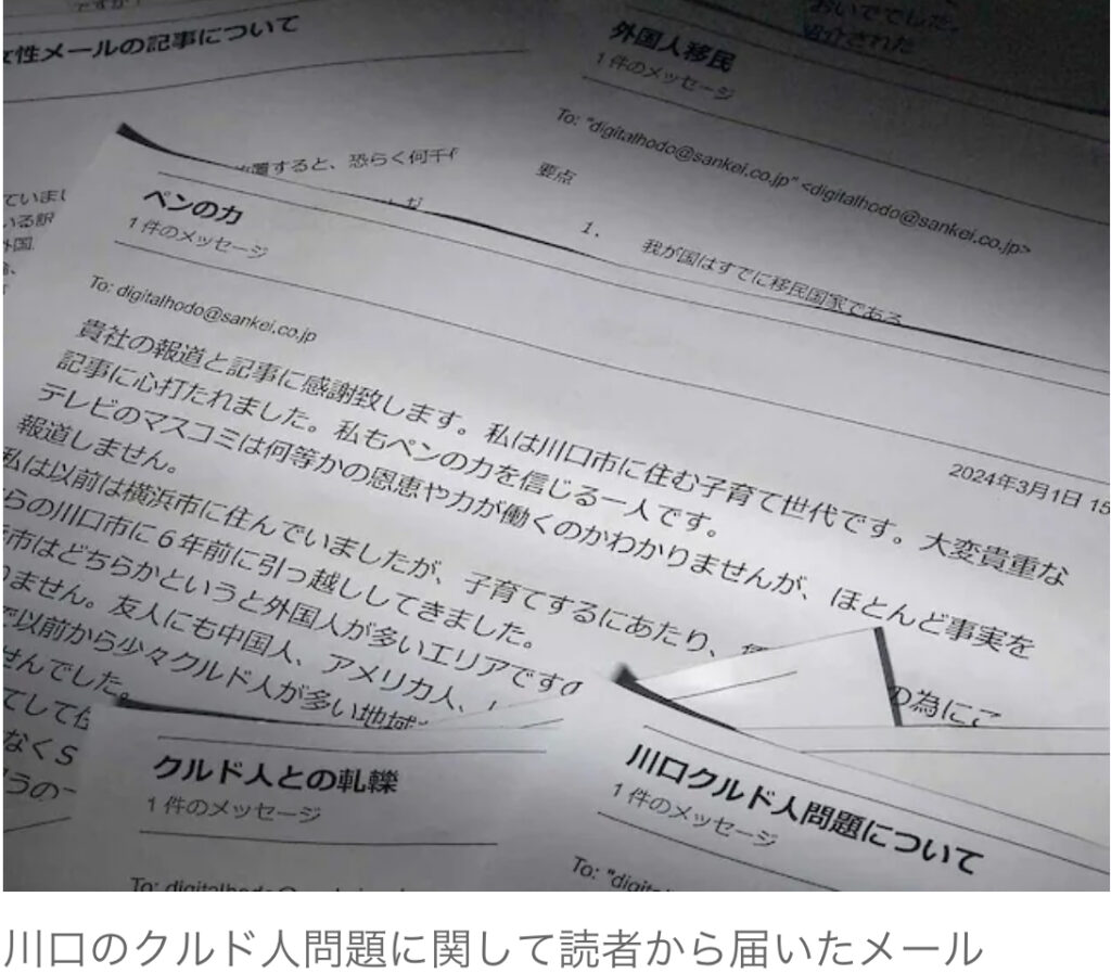 1: ◆Gap/News.k おっさん友の会 ★ 2024/03/04(月) 16:57:16.39 ID:0rNsQbu+9 埼玉県川口市に住む女性が制作したクルド人問題に関するメッセージ画像やメールによる訴えなどを産経ニュースで紹介したところ、多くの読者の声が届いた。 近年SNS(交流サイ... -