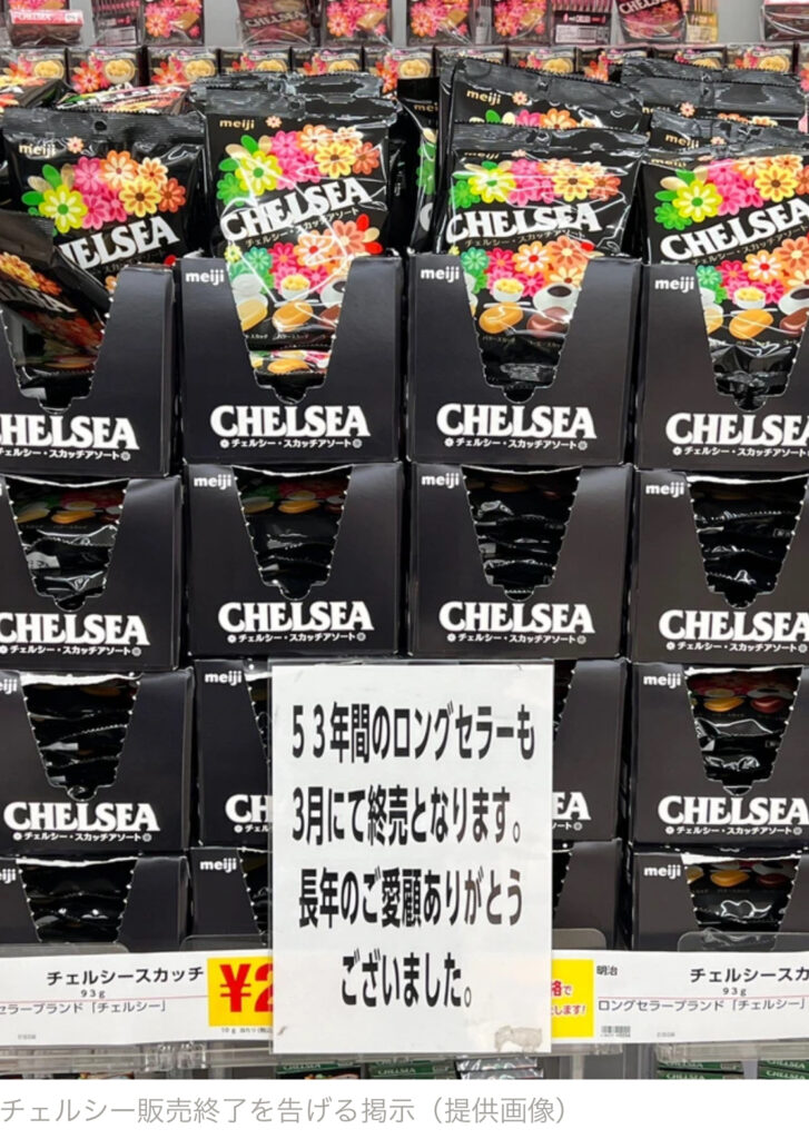 1: Ikhtiandr ★ 2024/03/04(月) 11:03:41.32 ID:WB8zfAQ69 明治のキャンディー「チェルシー」が3月に販売を終了することが分かりました。明治は既に取引先に終売を伝え始めており、販売終了を掲示するお菓子売り場も出ています。 【写真】「ご愛顧ありがと... -