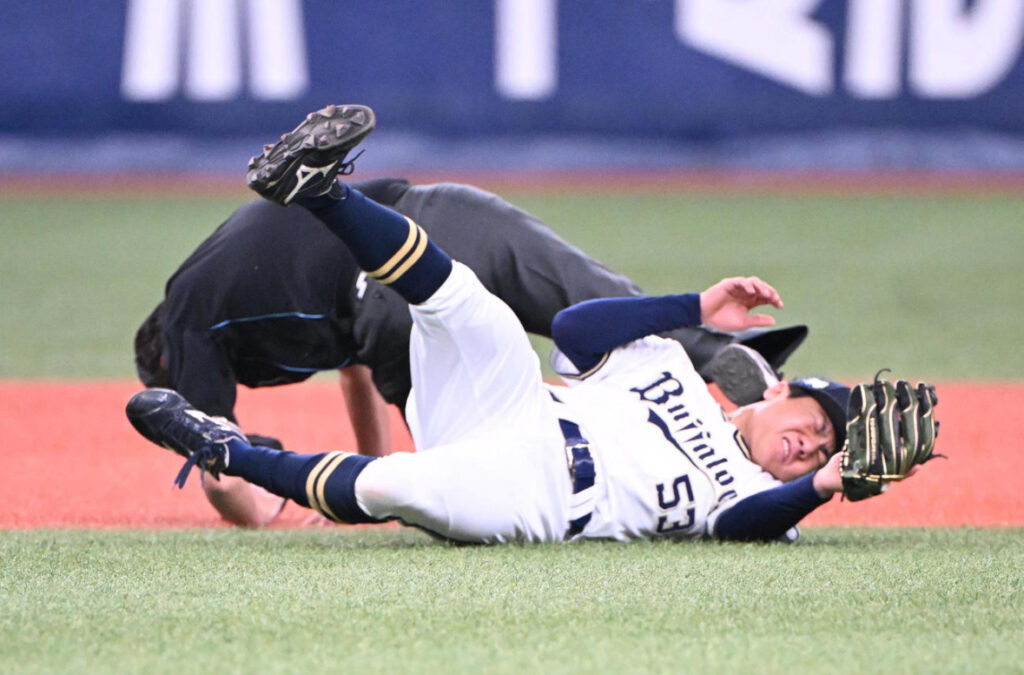 【珍プレー】オリックス宜保翔がボールを避けようとした白井一行塁審と激突 2人ともうずくまる