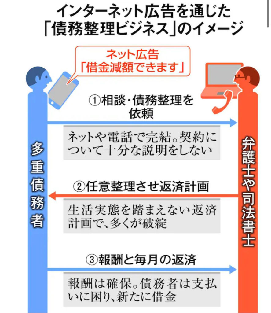 1: はな ★ 2024/03/03(日) 15:23:23.88 ID:t5eqGLQ19 「借金減額」ネット誇大広告のワナ 弁護士の貧困ビジネスか、対策団体発足 2024/3/2 18:06 産経新聞 https://www.sankei.com/article/20240302-NJEA4VJAWFIKTEL2B53JW5RDXU/ 多重債務者が「借金を減...