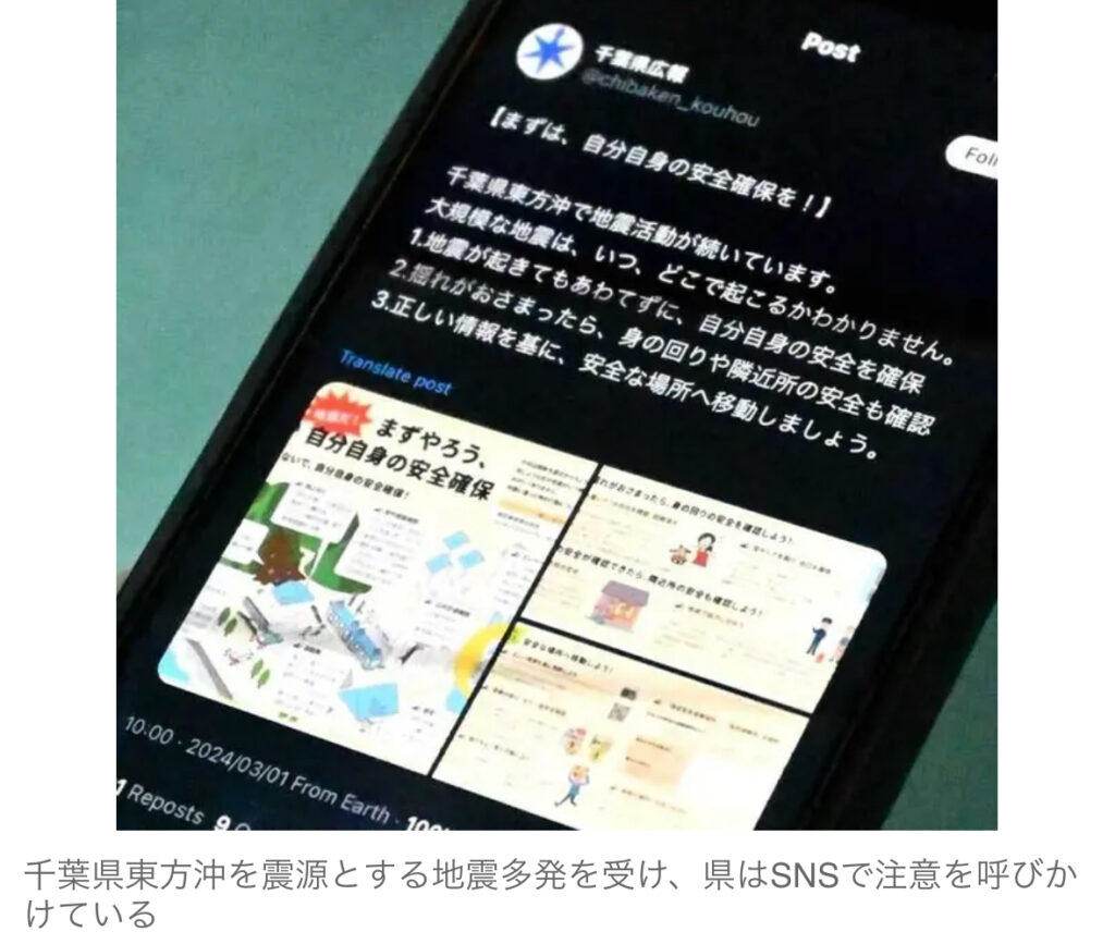 1: 首都圏の虎 ★ 2024/03/02(土) 22:26:09.89 ID:pm5/r5Yw9 千葉県内で地震が多発している。県東方沖を震源とする揺れが続いている他、2日未明には県南部が震源のマグニチュード(M)5・0の地震が発生し、千葉市若葉や長南町、いすみ市などで震度4の揺れ...