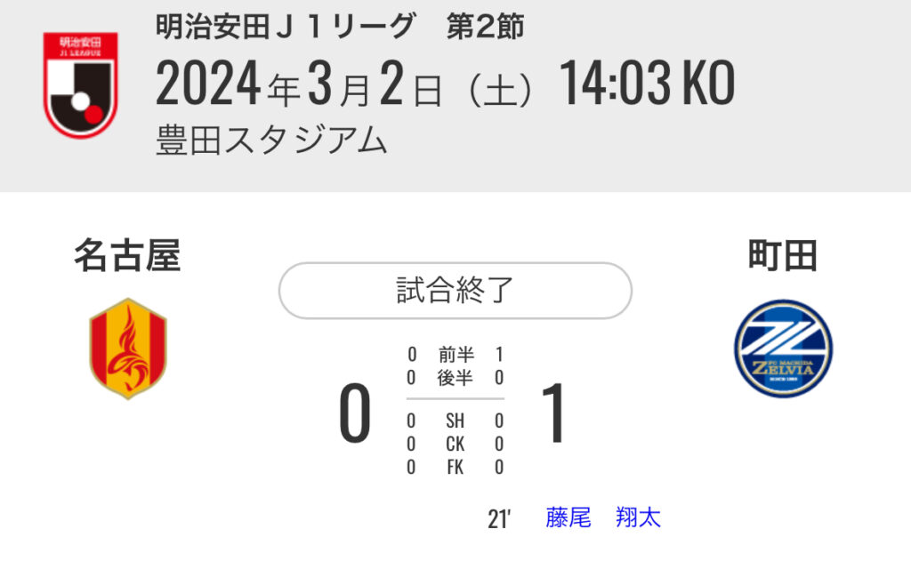 1: 久太郎 ★ 2024/03/02(土) 16:01:43.21 ID:NDU+vAVr9 名古屋 0-1 町田 [得点者] 21'藤尾 翔太(町田) スタジアム:豊田スタジアム 入場者数:30,415人 https://www.jleague.jp/match/j1/2024/030202/live#live/ 京都 1-2 湘南 [得点者] 15'... -