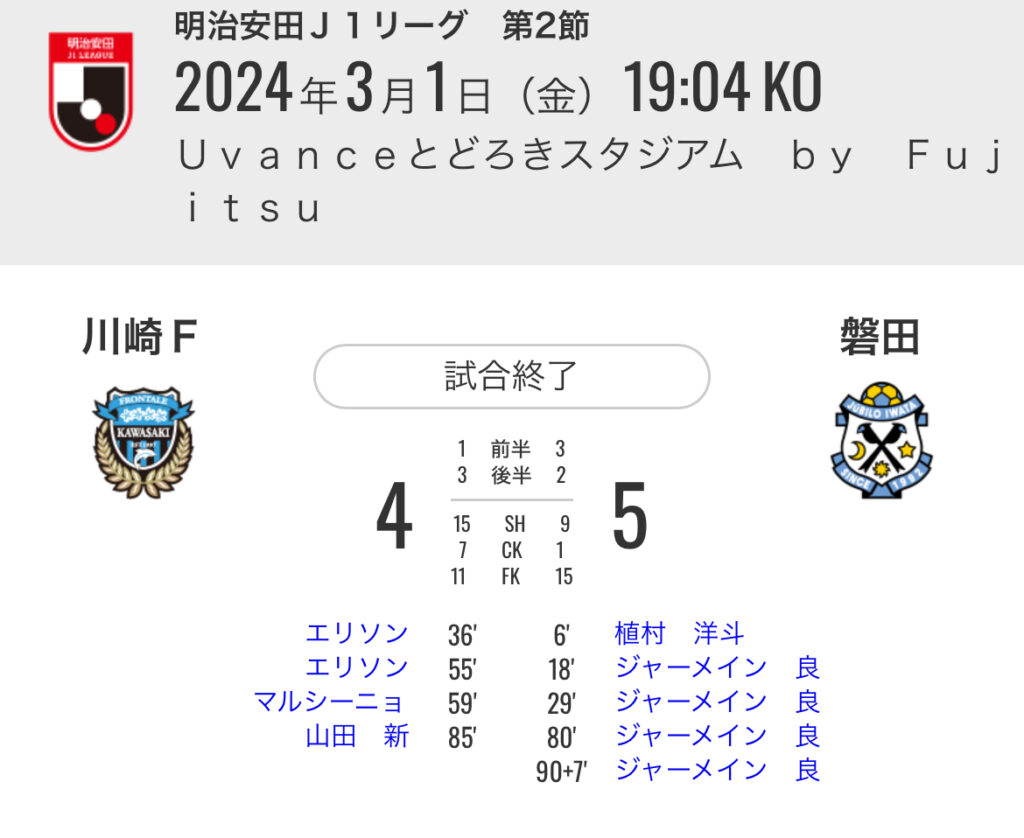1: 久太郎 ★ 2024/03/01(金) 21:13:34.84 ID:f4/4xSnj9 川崎 4-5 磐田 [得点者] 06'植村 洋斗 (磐田) 18'ジャーメイン 良 (磐田) 29'ジャーメイン 良 (磐田) 36'エリソン (川崎) 55'エリソン (川崎) 59'マル...