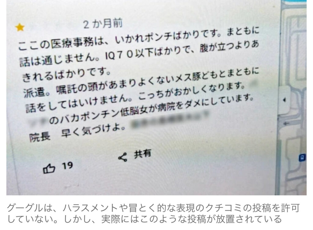 1: コバーン ★ 2024/02/29(木) 20:54:18.34 ID:??? TID:cobain 飲食店や病院などを選ぶ際に、参考になる「クチコミ」。しかし、実名を挙げての罵詈雑言や暴力的な書き込みが削除されずに放置されているとして、国内で最も多く利用されているグーグルマップ... -