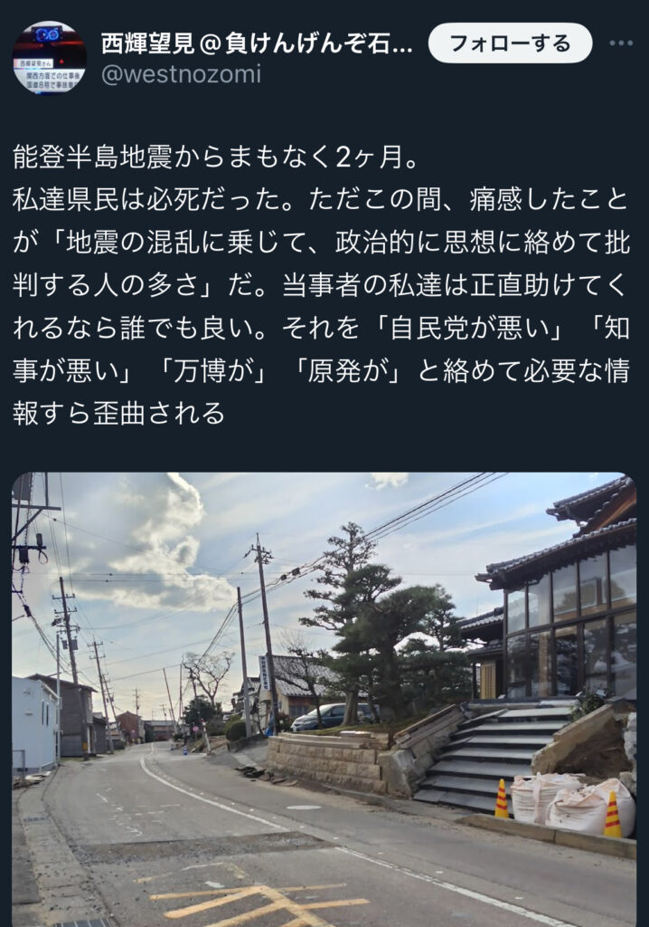 1: 名無しさん@涙目です。(愛媛県) [ニダ] 2024/02/28(水) 22:14:43.32 ID:lEIWsGtM0● BE:135853815-PLT(13000) sssp://img.5ch.net/premium/1372836.gif 西輝望見@負けんげんぞ石川@westnozomi 能登半島地震からまもなく2ヶ月。 私達県民は必死だった。た... -