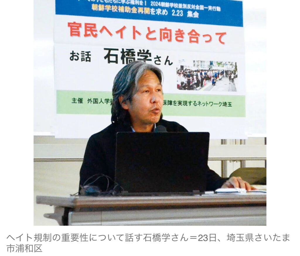 1: おっさん友の会 ★ 2024/02/27(火) 10:09:33.02 ID:EDo0THN+9 埼玉県さいたま市浦和区のコムナーレで23日、埼玉朝鮮学校への補助金再開などを求め活動する市民団体が集会を開き、神奈川新聞記者の石橋学さんが「官民ヘイトと向き合って」と題し講演した... -