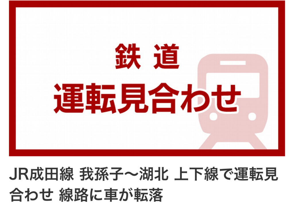 【鉄道事故】JR成田線 我孫子~湖北 上下線で運転見合わせ 線路に車が転落
