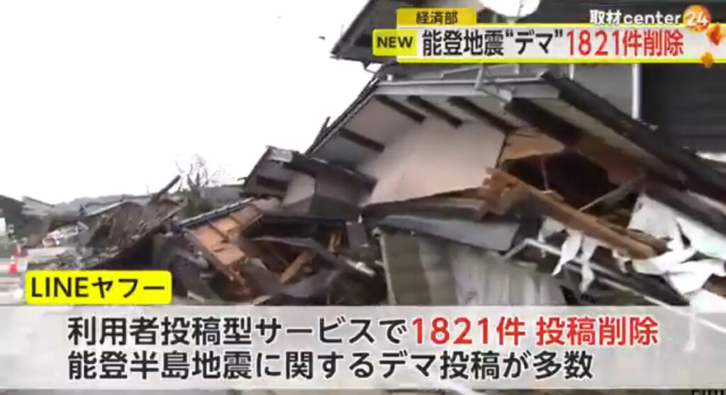 【LINEヤフー】能登半島地震の “ニセ情報・誤情報” 巡る投稿削除が1821件・・・コロナワクチンをめぐるデマ情報が多かった2023年までの削除件数1320件余りを、2カ月足らずで大きく上回った