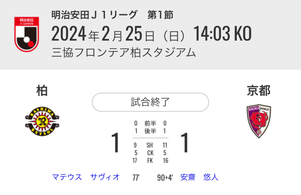 1: 久太郎 ★ 2024/02/25(日) 16:02:21.63 ID:nxTcTSyE9 柏 1-1 京都 [得点者] 77'マテウス サヴィオ(柏) 90+4'安齋 悠人 (京都) スタジアム:三協フロンテア柏スタジアム 入場者数:10,478人 https://www.jleague.jp/match/j1/2024/022501... -