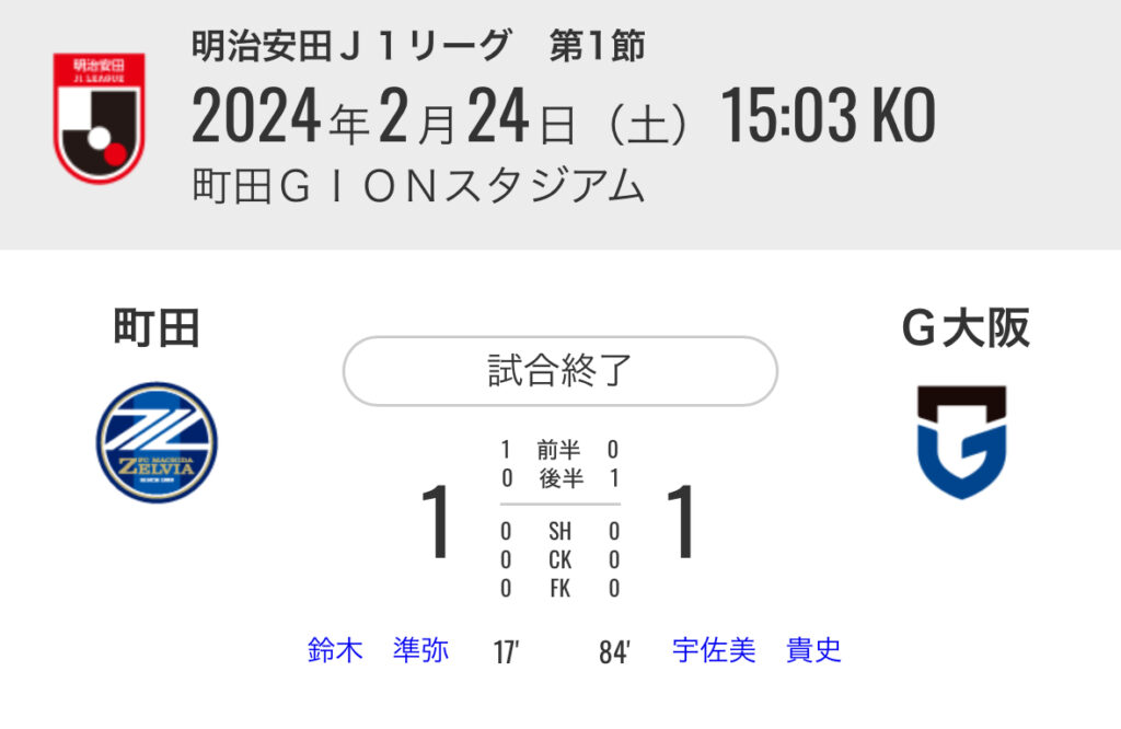 1: 久太郎 ★ 2024/02/24(土) 17:03:07.10 ID:hF0gjvwF9 町田 1-1 G大阪 [得点者] 17'鈴木 準弥 (町田)PK 84'宇佐美 貴史(G大阪) スタジアム:町田GIONスタジアム 入場者数:13,506人 https://www.jleague.jp/match/j1/2024/022405/live#li... -