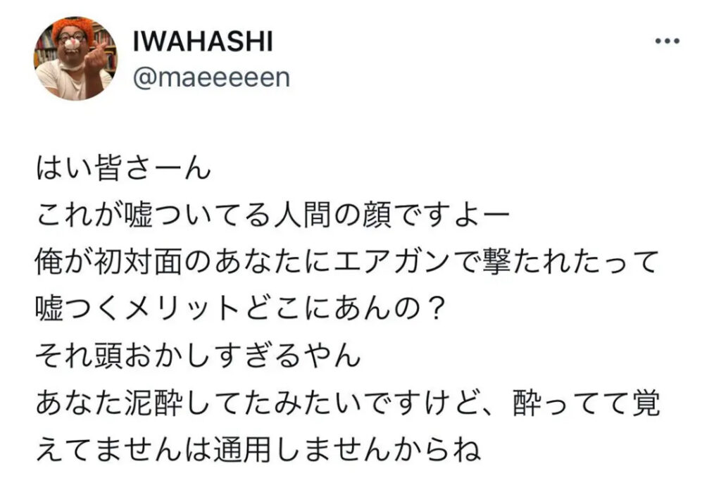 1: Ailuropoda melanoleuca ★ 2024/02/22(木) 20:12:17.80 ID:/s6w0RTC9 《はい皆さーん これが嘘ついてる人間の顔ですよー》 2月22日にXでこう呼びかけたのは、怒涛の勢いで投稿を続けるお笑いコンビ「プラス・マイナス」の岩橋良昌(45)。“エアガン発... -