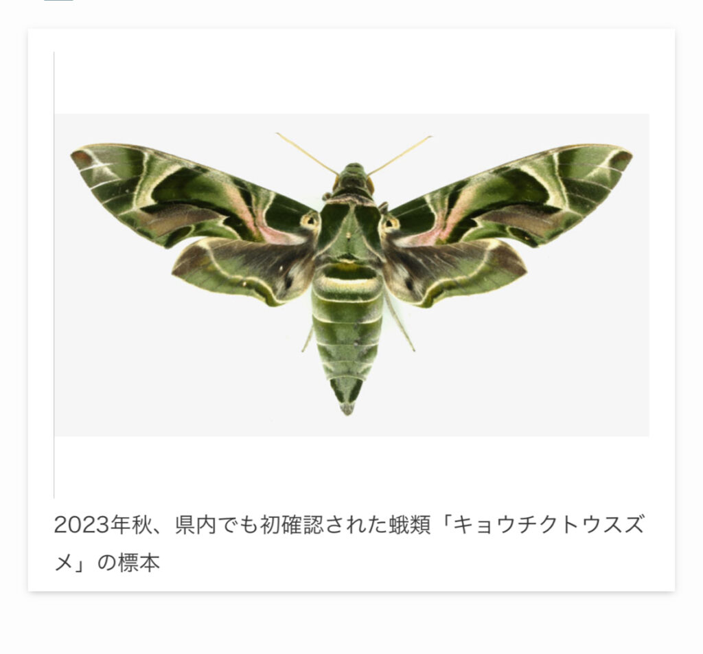 1: 朝一から閉店までφ ★ 2024/02/22(木) 15:10:10.43 ID:??? TID:syoubainin 2024/02/21/18:32 沖縄県など南方に生息する大型の蛾(が)類「キョウチクトウスズメ」が昨年秋、県内で初めて確認された。同時期に近県でも発生しており、台風などの影響で南... -
