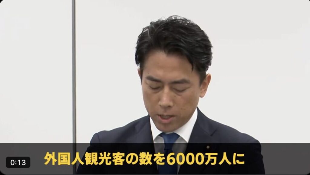 小泉氏「2030年に外国人観光客6000万人に、消費額を15兆円に増やします」