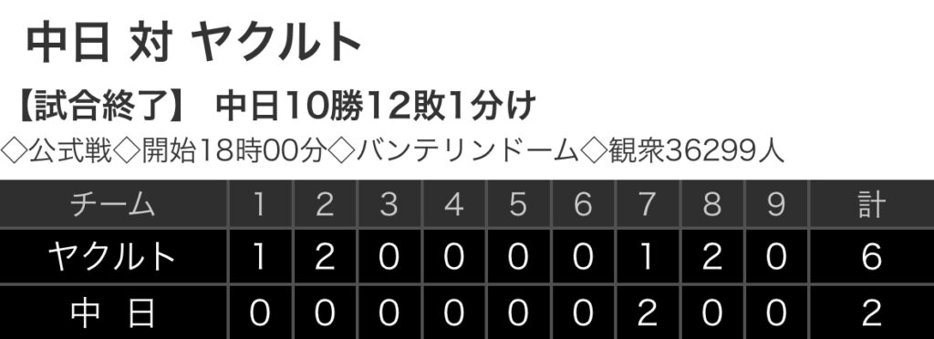 【中田翔引退試合】セ・リーグ D 2-6 S [9/19] ヤクルト連勝 吉村7回2失点、長岡2安打2打点 中日4連敗