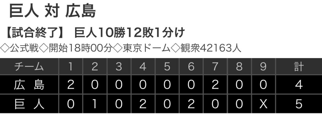 1: 鉄チーズ烏 ★ 2025/09/19(金) 21:01:09.49 ID:zsPN+hyq9 広島 2 0 0 0 0 0 2 0 0 |4 巨人 0 1 0 2 0 2 0 0 x |5 【バッテリー】 (広)大瀬良、栗林、島内 - 會澤 (巨)山﨑、中川、大勢、マルティネス - 岸田 【... -