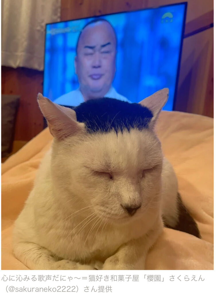 どっちが細川たかし!?一度見たら忘れられないヘアスタイルの猫さん テレビ画面の「ご本人」と奇跡のツーショットが話題