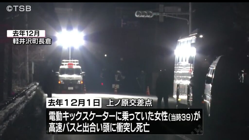 1: Hitzeschleier ★ 2024/02/21(水) 22:10:04.60 ID:wb3Zf6Yx9 去年、北佐久郡軽井沢町で電動キックスケーターに乗っていた39歳の女性がバスと衝突して死亡した事故で警察は21日、道路交通法違反の疑いで女性を容疑者死亡のまま書類送検しました。 事故は... -