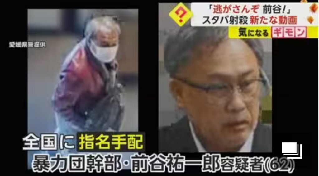1: おっさん友の会 ★ 2024/02/20(火) 12:36:13.25 ID:dJrncqW99 1月に愛媛県のスターバックスで起きた男性射殺事件で、愛媛県警は、指名手配中の暴力◯幹部、前谷祐一郎容疑者(62)の特徴を伝える動画を公開し、情報提供を呼び掛けている。 ●「逃がさんぞ... -
