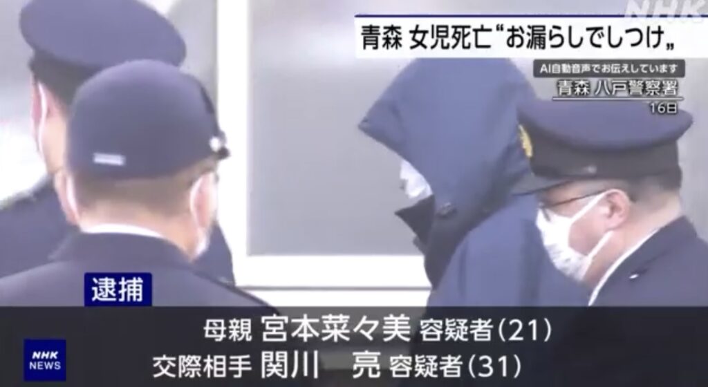 1: nita ★ 2024/02/17(土) 07:56:54.92 ID:u1OcsaT09 2024年2月17日 6時34分 青森県八戸市で、5歳の長女に浴槽で水を浴びせて放置し低体温症で死亡させたとして、母親と交際相手が逮捕された事件で、2人は、お漏らしをした長女に対するしつけだったという... -