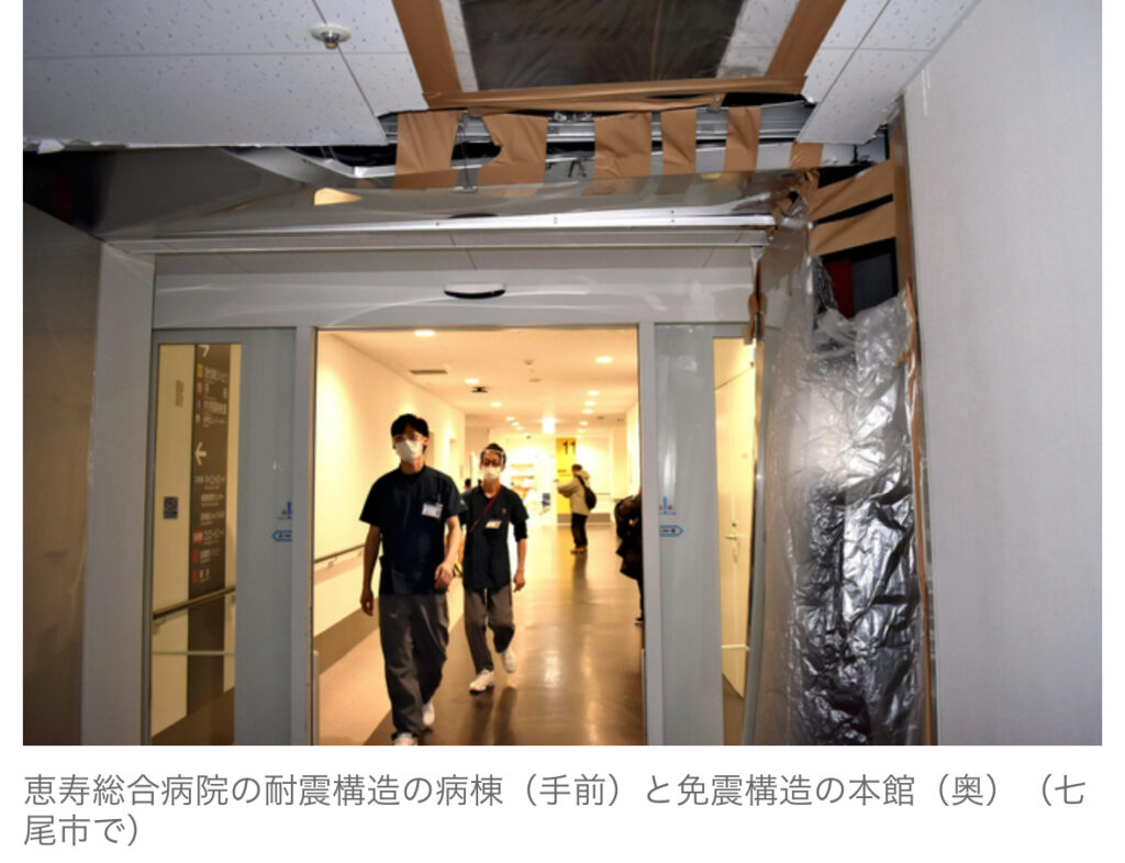 1: 首都圏の虎 ★ 2024/02/17(土) 08:00:27.56 ID:HOn0PA1Y9 (略)免震化で損傷なし 耐震化で損傷 5日は、震度6強を観測した七尾市の恵寿総合病院を訪ねた。入院患者の転院を余儀なくされた病院もあったが、ここでは、地下に揺れを吸収するゴムを設置した... -