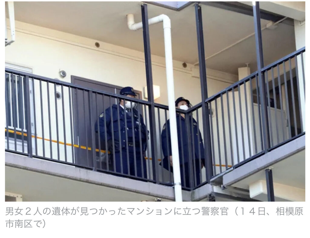 1: ぐれ ★ 2024/02/14(水) 11:23:59.29 ID:7Fvi+H6m9 >>2024/02/14 09:27 読売新聞 13日午後7時半頃、相模原市南区上鶴間本町のマンションの1室で、住人の夫婦とみられる2人の遺体が見つかった。同居する10歳代の少年が所在不明となってい... -