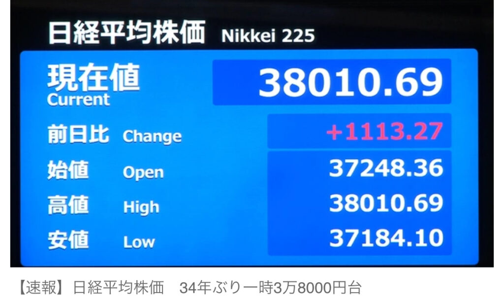 【速報】日経平均株価 34年ぶり一時3万8000円台