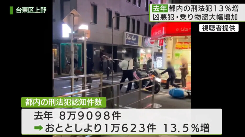 1: 首都圏の虎 ★ 2024/02/13(火) 11:18:43.66 ID:JL+vI+3e9 去年の都内の刑法犯認知件数が、一昨年より13%余り増えたことが分かりました。中でも、侵入強盗や不同意性交等が50%以上増えるなど、凶悪犯の増加が目立っています。 警視庁によりますと、去年... -