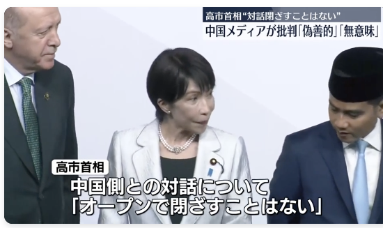 1: 1ゲットロボ ★ 2025/11/24(月) 19:56:14.34 ID:JQZbXPwr9 https://news.yahoo.co.jp/articles/0fd7c9926ce40608a9938d70e3c37fc60ade63dc 高市早苗総理が国会で、台湾有事が「存立危機事態になり得る」と発言したことをめぐり、急速に関係が悪化して... -