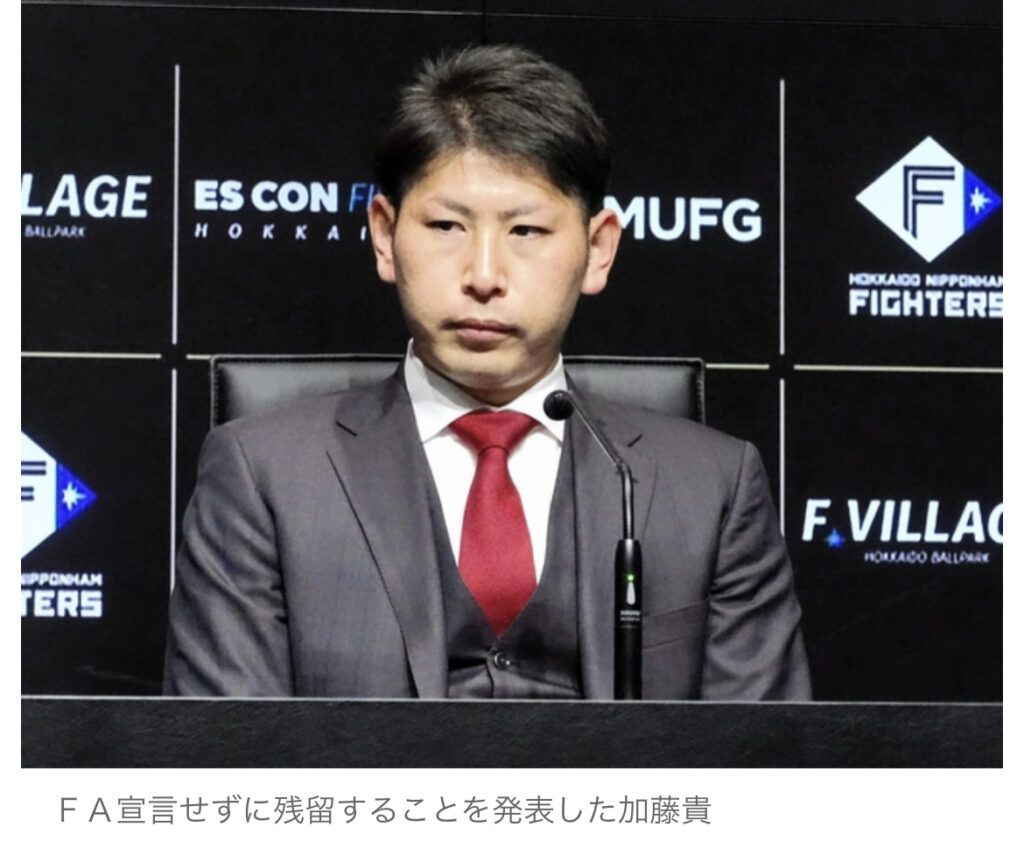 1: ニーニーφ ★ 2023/11/11(土) 17:10:28.79 ID:nvyLF9ke9 FA権を取得している日本ハムの加藤貴之投手(31)が11日、北海道北広島市のエスコンフィールドで会見し、FA宣言せずに残留することを発表した。「このたびはFA権を使わずに来年もファ... -
