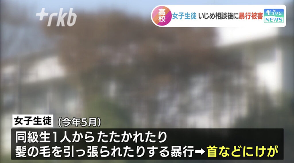 1: ばぐっち ★ 2023/11/09(木) 07:38:06.09 ID:??? TID:BUGTA 福岡県内の県立高校で1年の女子生徒が、学校にいじめの相談をした後に同級生から暴行の被害を受けていたことが分かりました。 学校によりますと、今年4月、福岡県内北九州地区の県立高校で1年... -