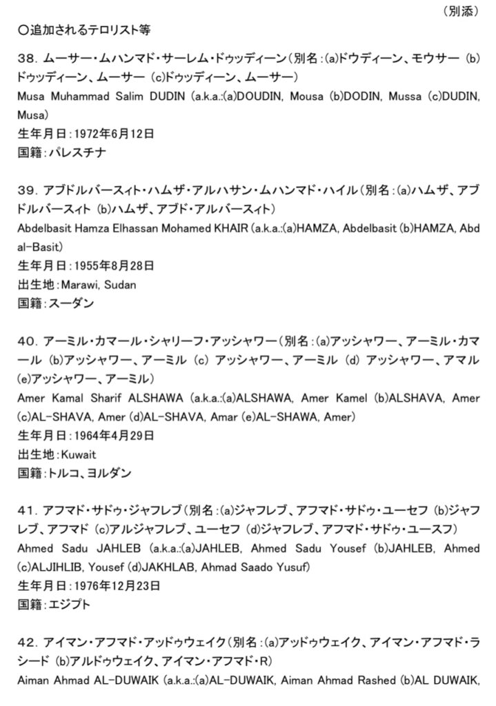 日本政府、新たにテロリスト等に対する資産凍結対象者を追加