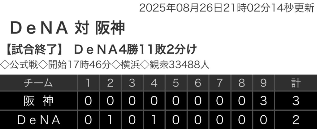 1: 鉄チーズ烏 ★ 2025/08/26(火) 21:00:42.66 ID:PbGhvuiM9 阪神 0 0 0 0 0 0 0 0 3 |3 DeNA 0 1 0 1 0 0 0 0 0 |2 【バッテリー】 (阪) 村上、ハートウィグ、石井 - 坂本 (De)ケイ、伊勢、入江、中川虎... -