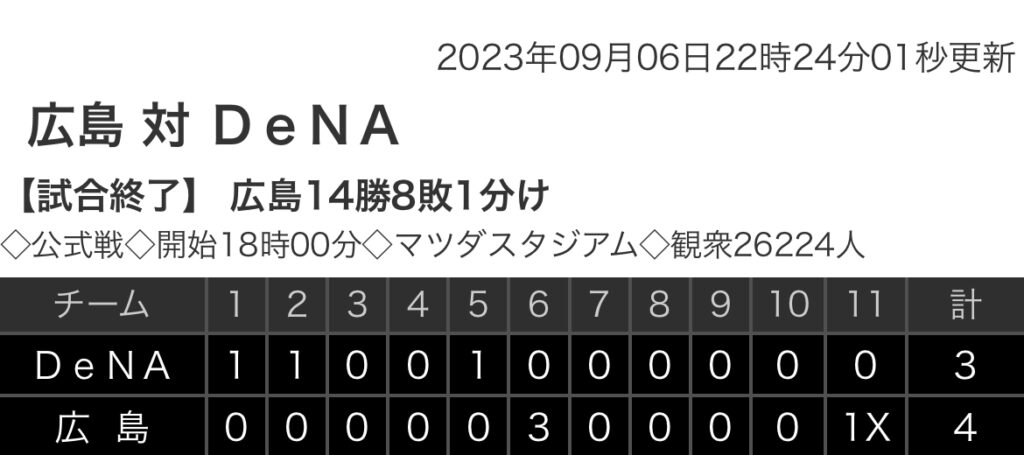 【野球】セ・リーグ C 4x-3 DB [9/6] 広島今日も延長サヨナラ勝ち!3連勝!デビッドソン19号サヨナラホームラン! DeNA 3連敗