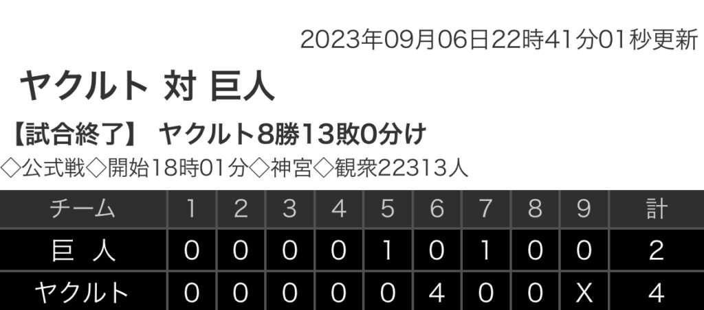 1: 鉄チーズ烏 ★ 2023/09/06(水) 22:32:18.42 ID:F+4Hai1u9 巨人 0 0 0 0 1 0 1 0 0 |2 ヤクルト 0 0 0 0 0 4 0 0 x |4 【バッテリー】 (巨)ビーディ、松井、バルドナード、田中千、菊地、今村 - 大城卓 (ヤ)小澤... -