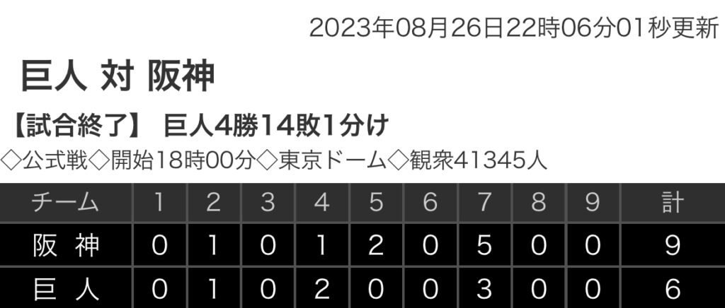 1: 鉄チーズ烏 ★ 2023/08/26(土) 21:56:03.60 ID:T8+S5FZo9 阪神 0 1 0 1 2 0 5 0 0 |9 巨人 0 1 0 2 0 0 3 0 0 |6 【バッテリー】 (阪)青柳、桐敷、加治屋、岩貞、石井、岩崎 - 坂本 (巨)横川、船迫、バルドナード、... -