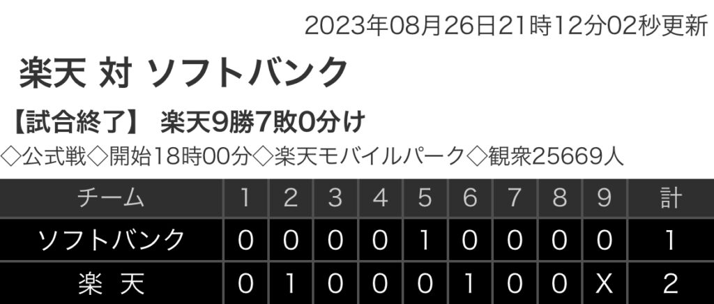 1: 鉄チーズ烏 ★ 2023/08/26(土) 21:01:57.25 ID:T8+S5FZo9 ソフトバンク 0 0 0 0 1 0 0 0 0|1 楽天. 0 1 0 0 0 1 0 0 x|2 【バッテリー】 (ソ)板東、田浦、大津、又吉 - 谷川原 (楽)田中将、渡辺翔、松井裕 ... -