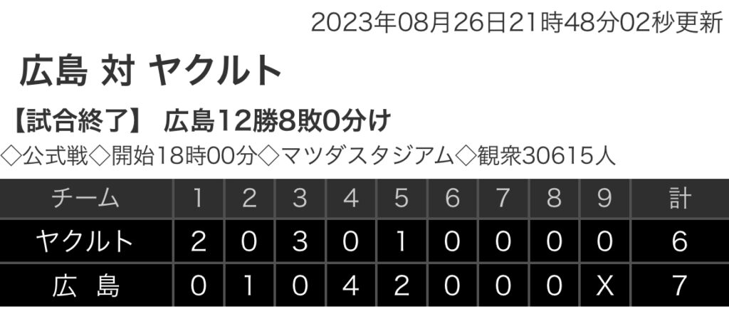 1: 鉄チーズ烏 ★ 2023/08/26(土) 21:47:07.78 ID:T8+S5FZo9 ヤクルト 2 0 3 0 1 0 0 0 0 |6 広島 0 1 0 4 2 0 0 0 x |7 【バッテリー】 (ヤ)ピーターズ、阪口、木澤、山本 - 中村 (広)森下、アンダーソン、中﨑、... -
