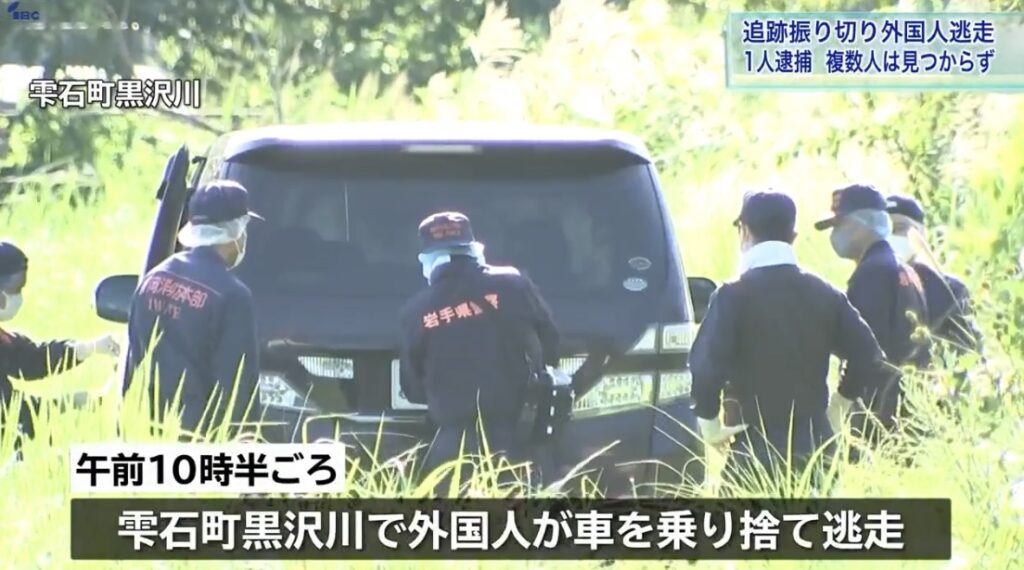 1: 樽悶 ★ 2023/08/22(火) 23:46:05.47 ID:3Gf7dbMG9 22日午前、岩手県雫石町と滝沢市で警察の追跡を受けていた複数の外国人が車を乗り捨て逃走しました。男1人の身柄は確保されましたが、残る複数の外国人は見つかっておらず警察が行方を追っています。 ... -