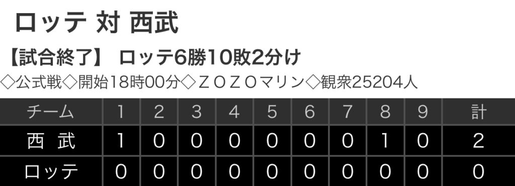 1: 鉄チーズ烏 ★ 2025/08/23(土) 20:57:35.63 ID:v+3WyXS39 西武. 1 0 0 0 0 0 0 1 0 |2 ロッテ 0 0 0 0 0 0 0 0 0 |0 【バッテリー】 (西)今井 - 古賀悠 (ロ)サモンズ、澤村、小野 、廣池- 佐藤 【本塁打】 (西... -