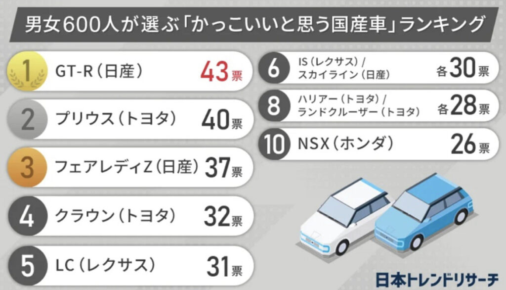 カッコいいなあと感じる国産車、2位「プリウス」、1位は?