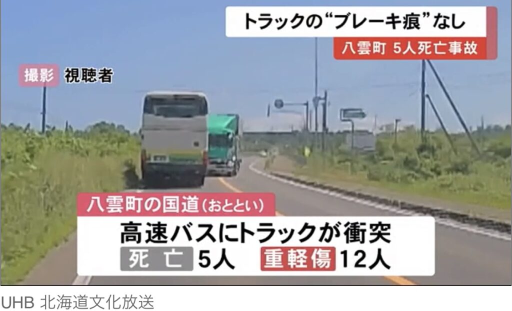 1: 夜のけいちゃん ★ 2023/06/20(火) 12:16:49.78 ID:Gk1nTvzs9 6/20(火) 11:56配信 北海道ニュースUHB 6月18日北海道南部の八雲町でトラックが対向車線にはみ出し、高速バスと正面衝突し、5人が死亡した事故で、トラックのブレーキ痕が現場に残っていない... -