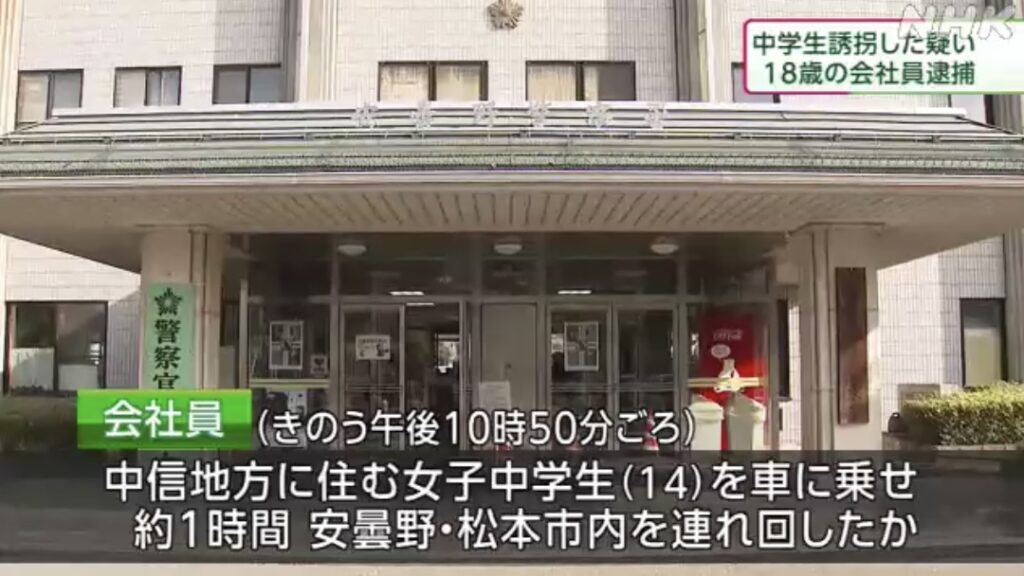 1: ジャコビニ・チンナー彗星(ジパング) [ES] 2023/06/20(火) 12:06:32.92 ID:JaxfDd3S0● BE:323057825-PLT(13000) sssp://img.5ch.net/premium/3755621.gif 中信地方に住む女子中学生をおよそ1時間に渡って安曇野市内などを車で連れ回したとして、18歳... -