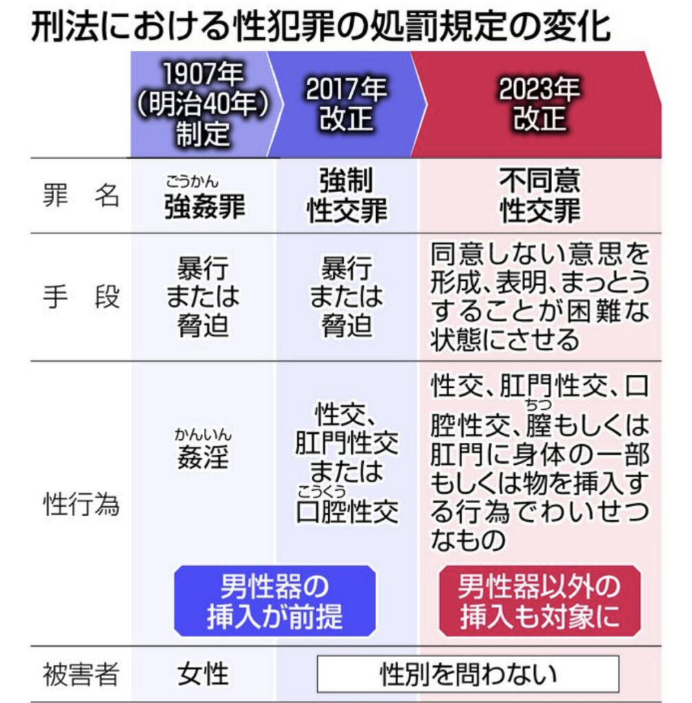 1: nita ★ 2023/06/17(土) 06:54:52.95 ID:UyVCAwH/9 2023年6月17日 06時00分 16日に成立した改正刑法では、強制性交罪が「不同意性交罪」に変更され、対象の性行為の規定も大きく変わった。明治期の法制定時から「男性器の挿入」に限られていたが、手指や... -