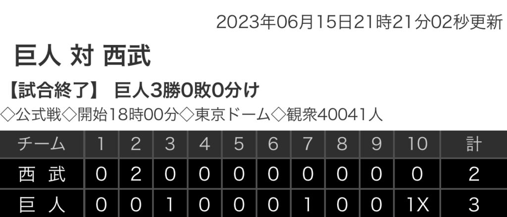 1: 鉄チーズ烏 ★ 2023/06/15(木) 21:21:13.74 ID:GIEDFmzH9 西武 0 2 0 0 0 0 0 0 0 0 |2 巨人 0 0 1 0 0 0 1 0 0 1X|3 【バッテリー】 (西)與座、森脇、佐藤隼、増田、平井 - 古賀 (巨)山﨑伊、大勢、中川 ... -