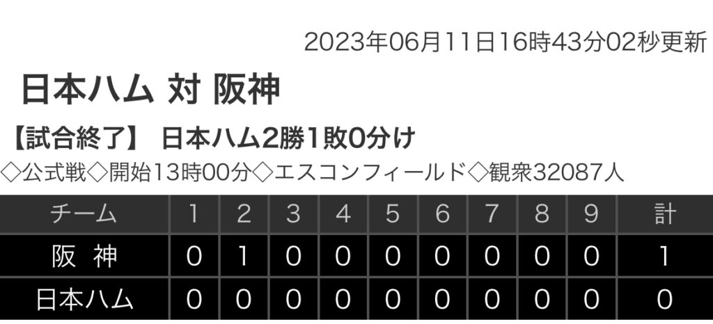 1: 鉄チーズ烏 ★ 2023/06/11(日) 16:42:17.69 ID:1MqoZ7zg9 阪神 0 1 0 0 0 0 0 0 0|1 日本ハム.. 0 0 0 0 0 0 0 0 0|0 【バッテリー】 (阪)才木、岩崎、湯浅 - 梅野 (日)北山、福田俊、杉浦、宮内、池田 - マ... -