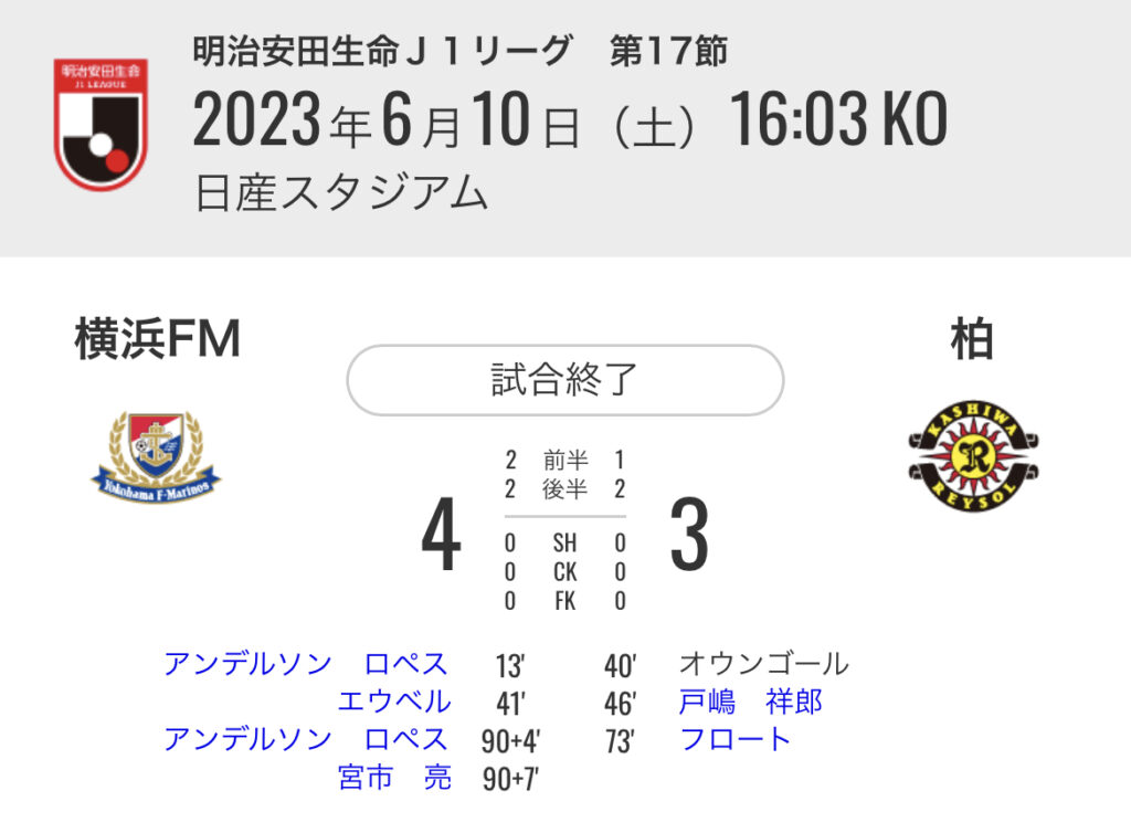 1: 久太郎 ★ 2023/06/10(土) 18:08:09.49 ID:0tyL3bZE9 横浜FM 4-3 柏 [得点者] 13'アンデルソン ロペス (横浜FM)PK 40'オウンゴール (柏) 41'エウベル (横浜FM) 46'戸嶋 祥郎 (柏) 73'フロート ...