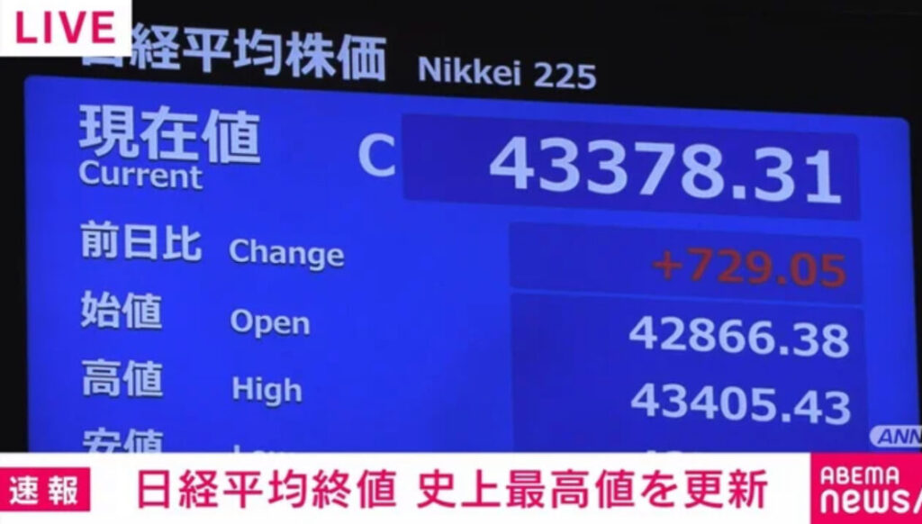 日経平均が史上最高値更新 729円高の4万3378円で取引終了