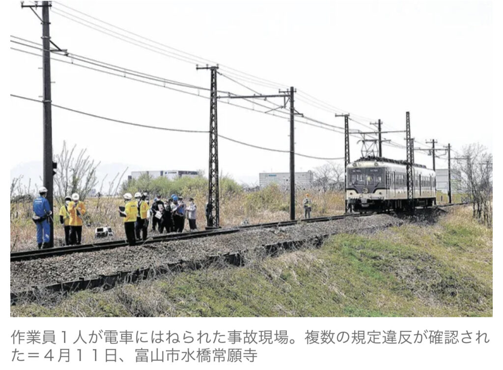 1: かに星雲(東京都) [US] 2023/06/08(木) 05:22:26.40 ID:dnctlolq0● BE:421685208-2BP(4000) sssp://img.5ch.net/ico/syobo2.gif 25メートル前で「電車!」叫ぶ 富山地鉄・作業員死亡事故 19歳の男性作業員が線路の補修作業中にはねられた死亡事故で... -