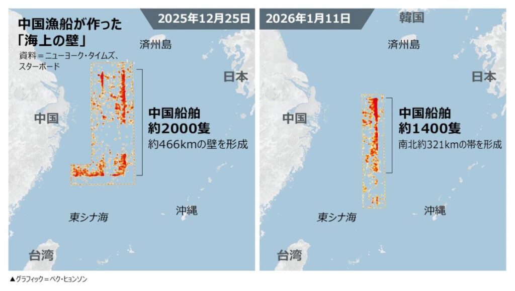 台湾封鎖のため?中国漁船数千隻、東シナ海に466km「海上の壁」を形成